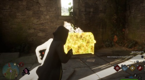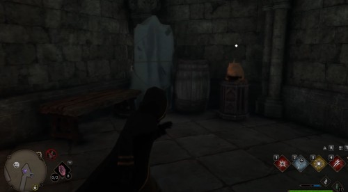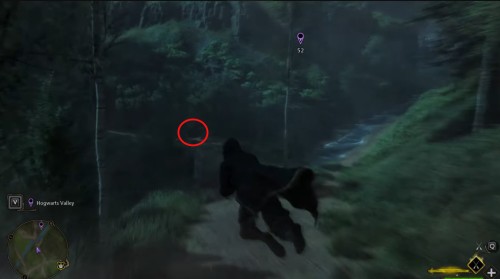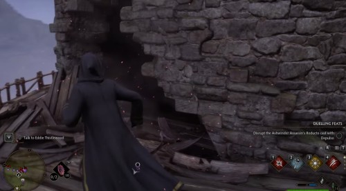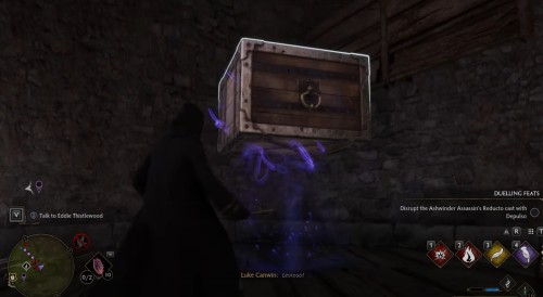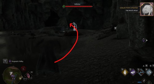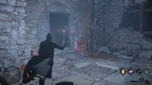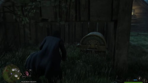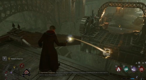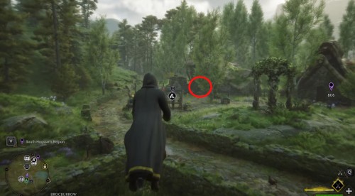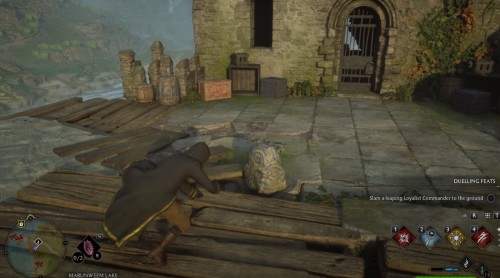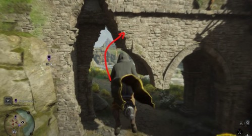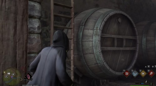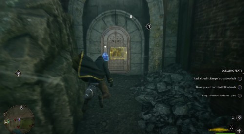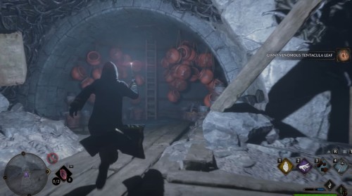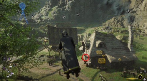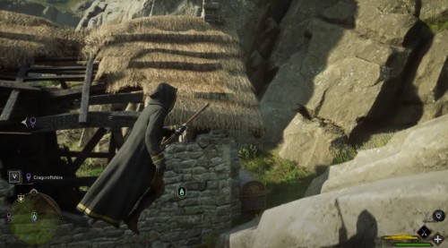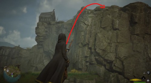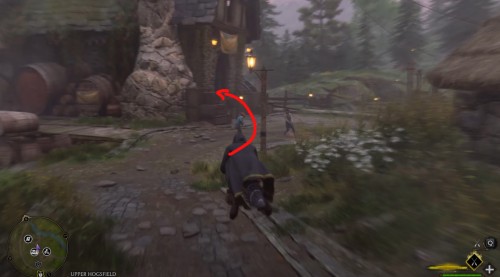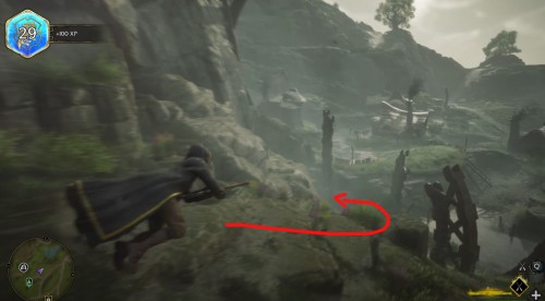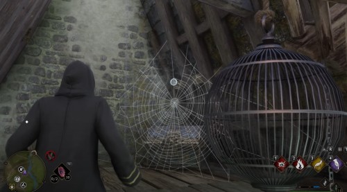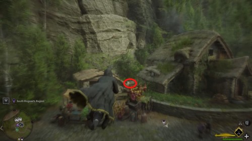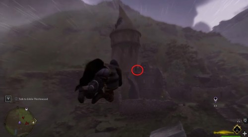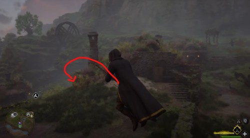 Перенеситесь в деревушку, а затем летите на запад к руинам возле горы. Приземлитесь на деревянной платформе возле башни и разрушьте ящик и бочку, чтобы разблокировать проход. Войдите внутрь, разберитесь с пауками и используйте Вингардиум Левиоса для поднятия коробки в центре помещения.