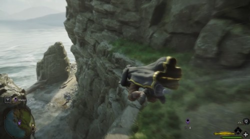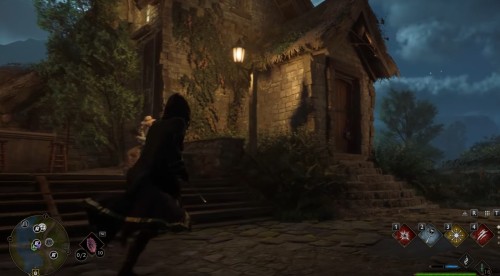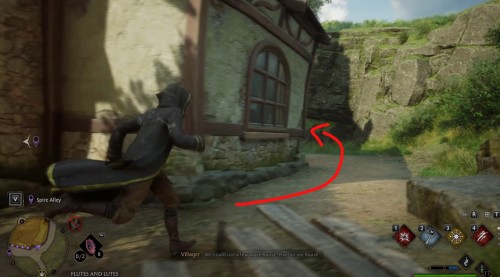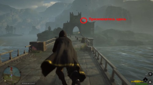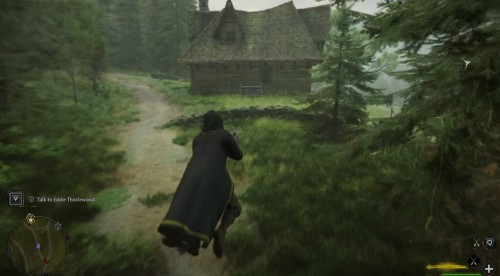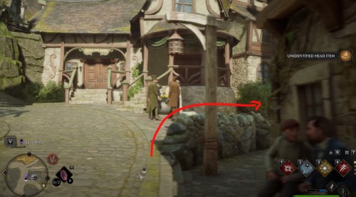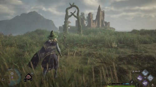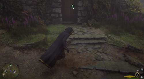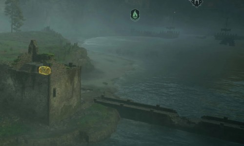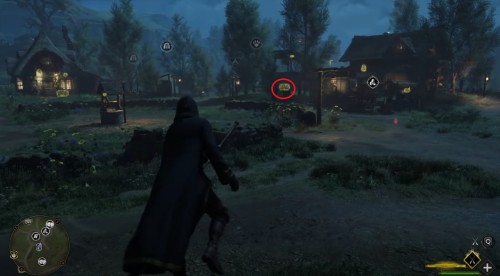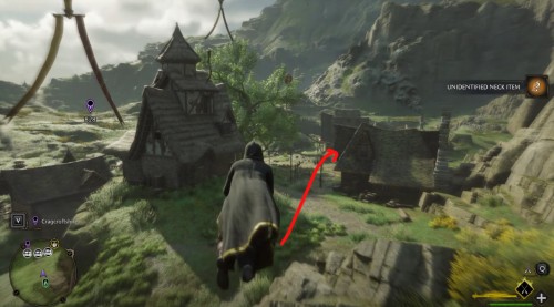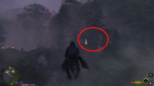 Телепортируйтесь к указанной точке, а затем сядьте на метлу и поднимитесь вверх к скале на севере. Перелетите через нее и направляйтесь к полуразрушенному особняку впереди. Вы найдете сундук в небольшой постройке. Взломайте замок второго уровня и войдите внутрь.