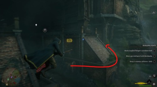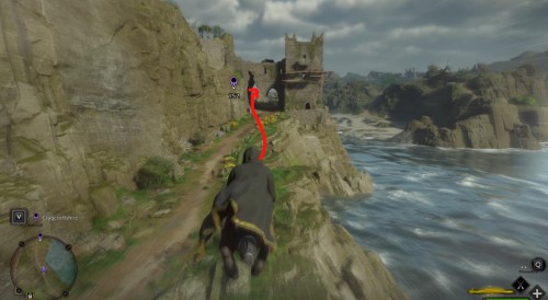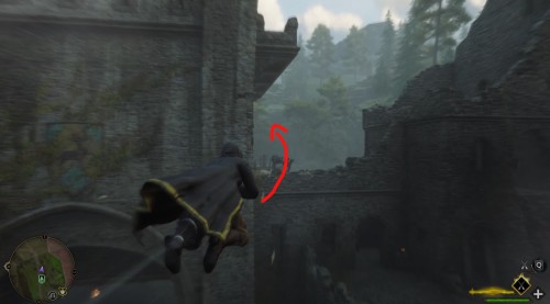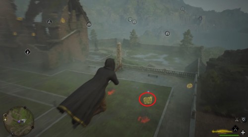 Направляйтесь в восточную часть района к указанной крепости. Поднимитесь в воздух на метле и подлетите к краю полуразрушенного замка, чтобы увидеть сундук на верхней площадке.