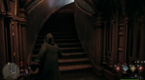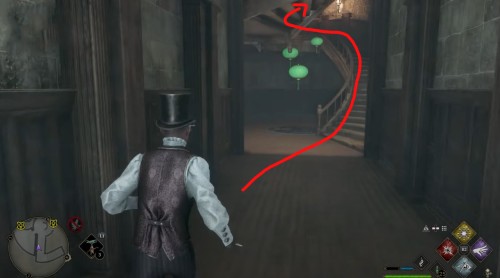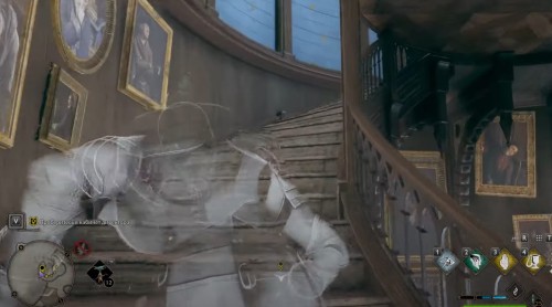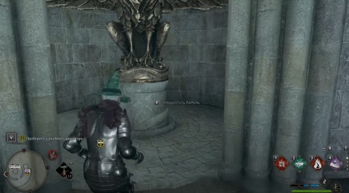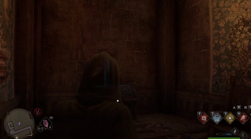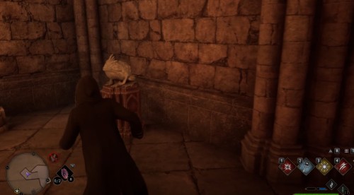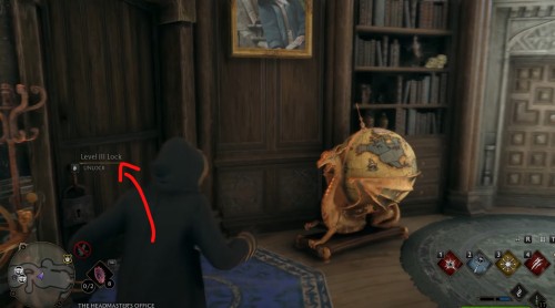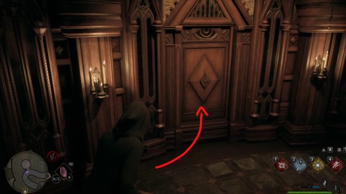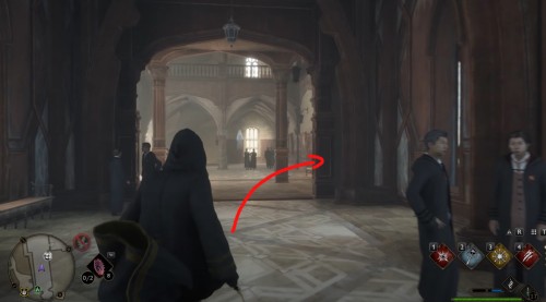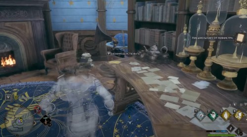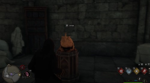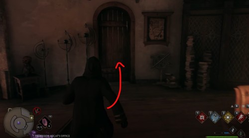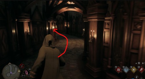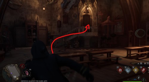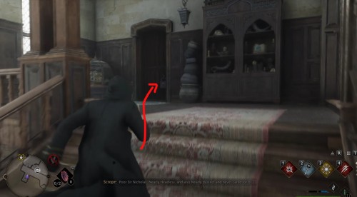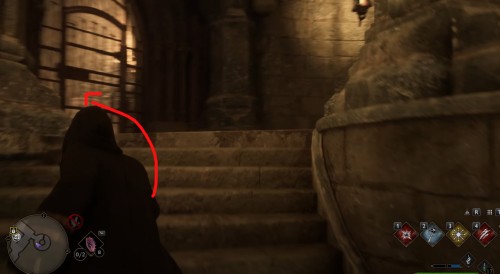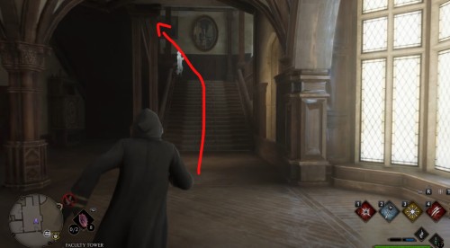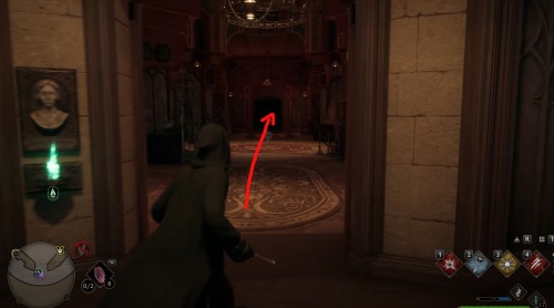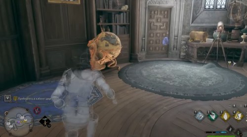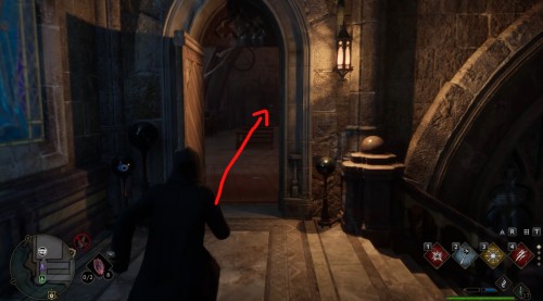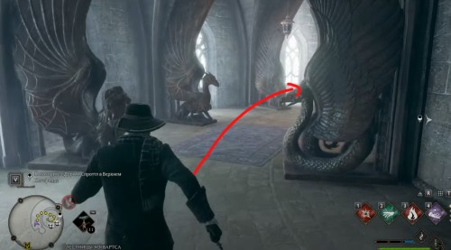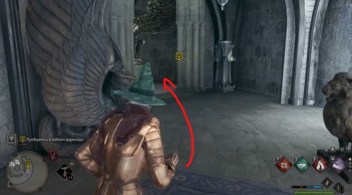 От предыдущего сундука возвратитесь назад к винтовой лестнице и поднимитесь по ней наверх. Попав в каменный коридор со статуями, сверните влево и пройдите наверх в кабинет директора школы. Вы сможете сделать это после прохождения сюжетного задания «Эффект оборотного зелья». Есть и другой способ – долететь до балкона на метле. Мы подробно разобрали оба метода в отдельном руководстве.