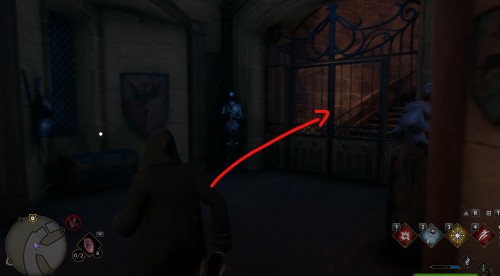 Выйдите из кабинета в коридор со статуями и бегите в другую сторону. В самом конце вы обнаружите странную решетчатую дверь с большой замочной скважиной в центре. Используйте ранее найденный ключ доступа, чтобы открыть эту дверцу. За ней вы найдете легендарный сундучок.