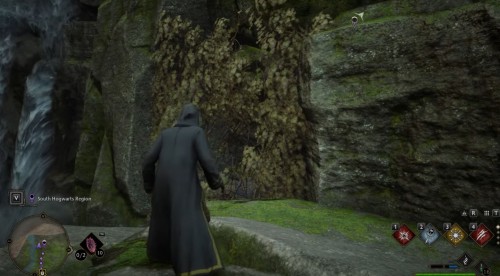 Отправляйтесь к фиолетовой точке, показанной на карте ниже. Здесь вы обнаружите водопад, справа от которого будет альков, скрытый за лозами. Сожгите растения с помощью огненного заклинания и заберите содержимое сундучка.