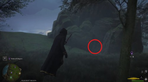 Отправляйтесь к указанной точке, а затем двигайтесь на запад. Возьмитесь за выполнение испытания Мерлина, расположенного неподалеку, чтобы уничтожить камень и разблокировать проход в скале. Затем просто сожгите лозы, и вы сможете забрать содержимое сундучка.