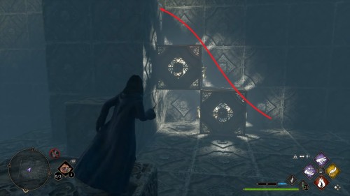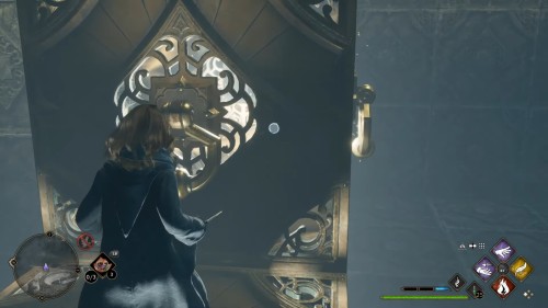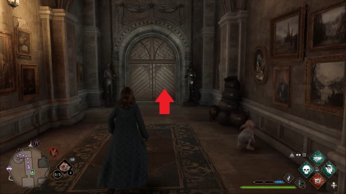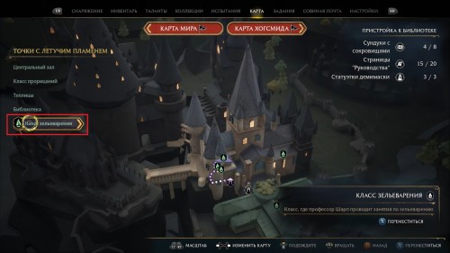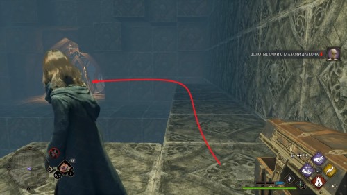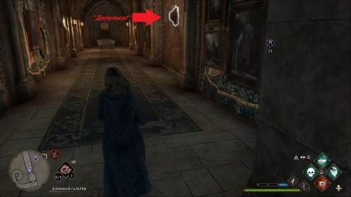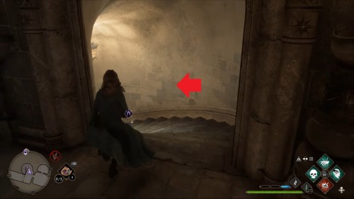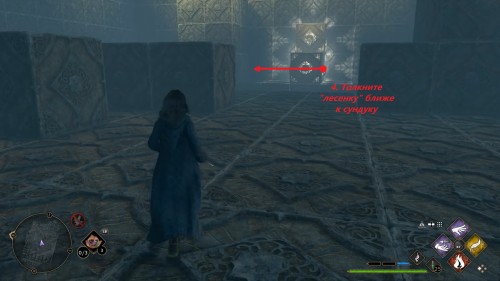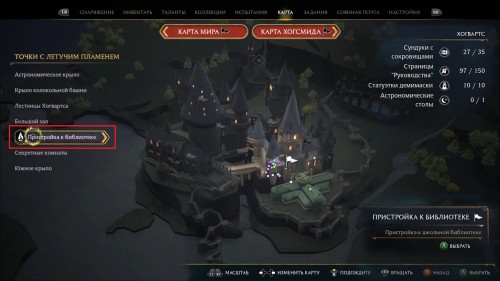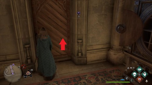 Первая комната с испытанием Депульсо находится в пристройке к библиотеке. Чтобы найти вход, используйте точку с летучим пламенем в классе зельеварения, затем выйдите из коридора налево и направляйтесь вниз по винтовой лестнице. Остается добежать до деревянной двери, за ней и будет потайной проход, которой активируется заклинанием «Депульсо».