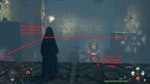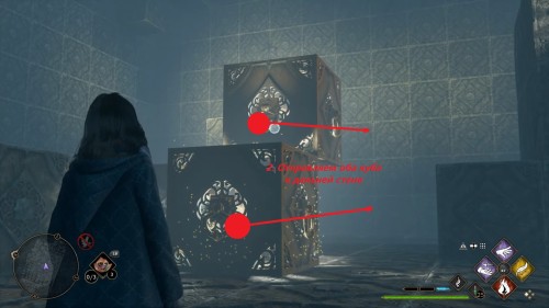 Вы окажетесь в зале с перемещающимися кубами и тремя сундуками на возвышениях. Мы указали на скриншоте ниже порядок их сбора, которого и предлагаем придерживаться.