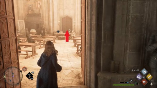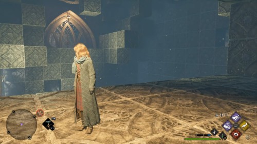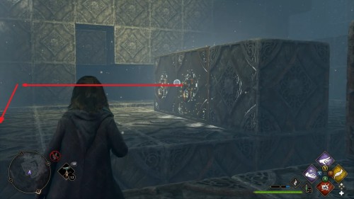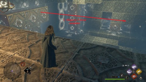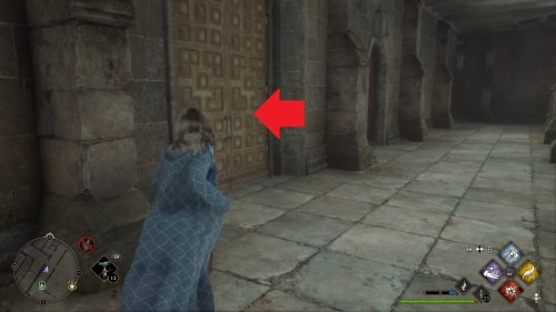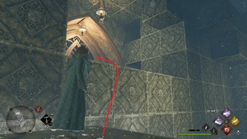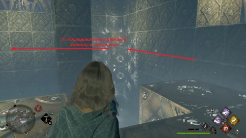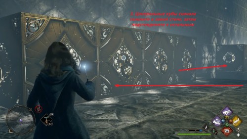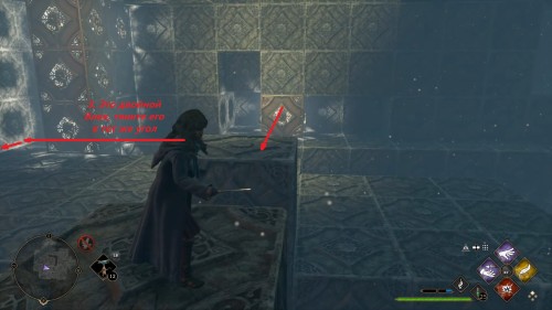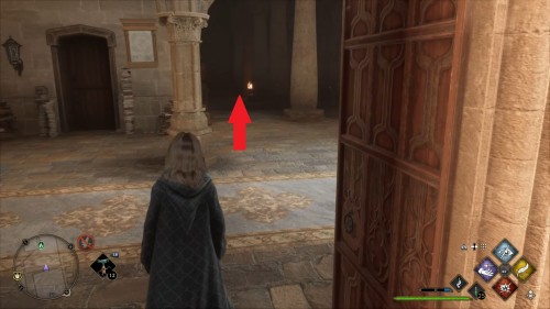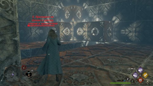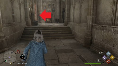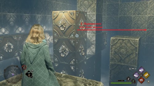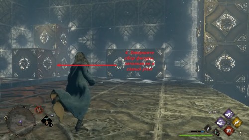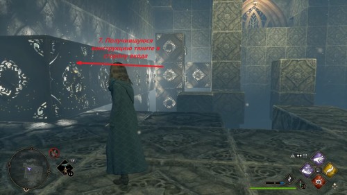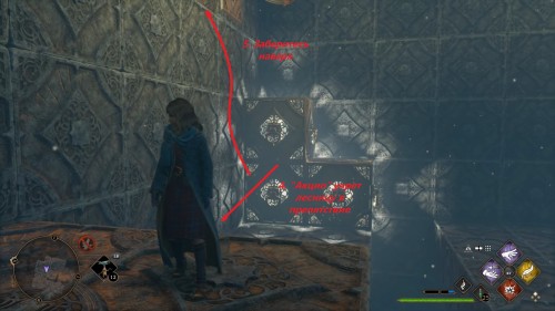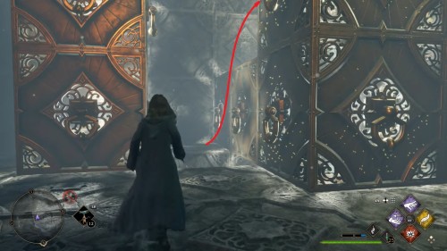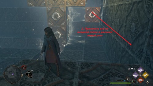 Вход во вторую комнату с головоломкой расположен в астрономическом крыле. Воспользуйтесь точкой с летучим пламенем во дворе трансфигурации. Затем сверните в дверь налево. Каждый поворот мы отметили на скриншотах. Как и предыдущие испытания, это откроется при использовании чар «Депульсо» на настенный орнамент.