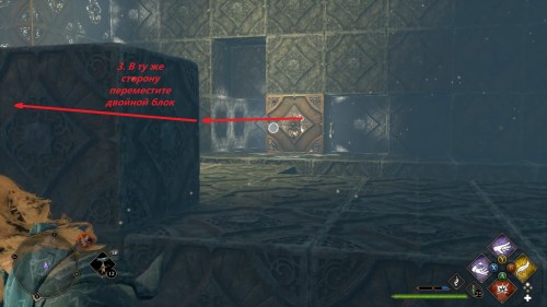 Первый сундук ждет на возвышении слева от входа. Сразу притяните Т-образный блок ко входу, освобождая дальний левый угол – в нем необходимо собрать лесенку из кубиков.