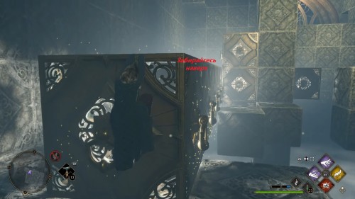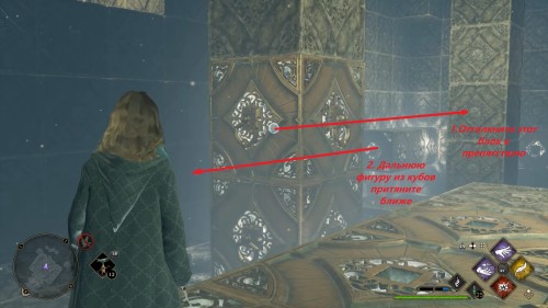 Теперь можно немного схитрить, как мы уже делали в одном из испытаний. Необходимо залезть на получившийся блок из кубиков и толкнуть его с помощью «Депульсо» к дальней стене прямо вместе с собой. После нужно будет только запрыгнуть и ухватиться за верхний край.