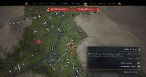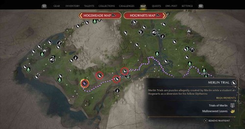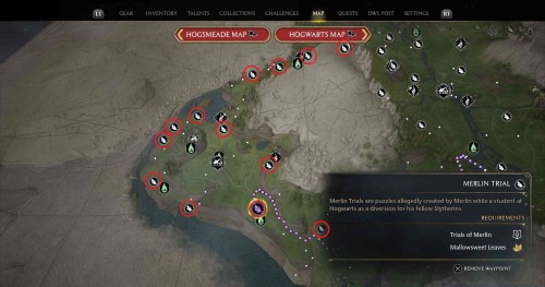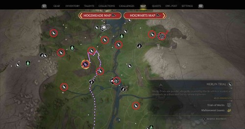 В самых проработанных районах магического мира испытаний Мерлина достаточно много. В южном Хогвартсе две основные зоны с ними расположены вдоль южной дороги и в холмах с восточной стороны озера.