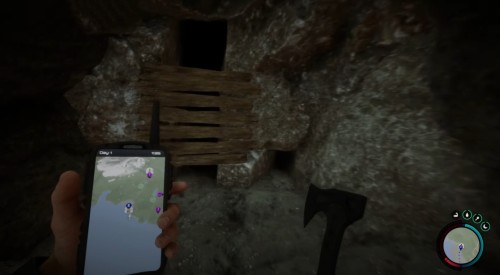 Войдите внутрь и сделайте еще несколько шагов вперед. Вы обнаружите вход в пещеру, который закрыт деревянными дощечками. Кстати, подобные доски в игре являются своеобразным признаком того, что в пещере находится ценный предмет. Итак, разломайте доски и пролезьте в щель.