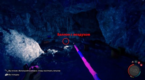Войдя внутрь, вы почти сразу же увидите впереди небольшой лагерь с ноутбуками и ящиками. Обязательно возьмите баллон с воздухом, стоящим возле фонаря. Он понадобится для ребризера. Теперь двигайтесь вперед по единственному пути. Оказавшись в просторной области со сталагмитами, продолжайте идти вперед.