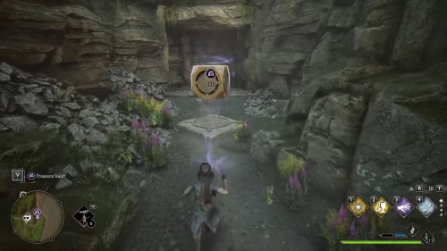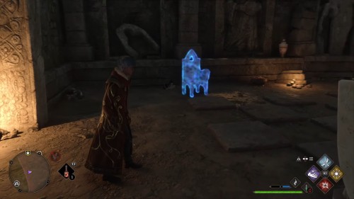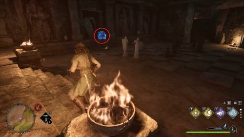 Изначально вход запечатан. Открыть его можно, если принести магический куб на платформу возле стены. Найдите блок справа от прохода и воспользуйтесь заклинаниями «Акцио» и «Левиосо», чтобы донести его до цели. Затем нужно поджечь куб любым из огненных заклинаний, после чего вход будет открыт.