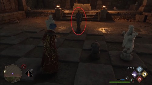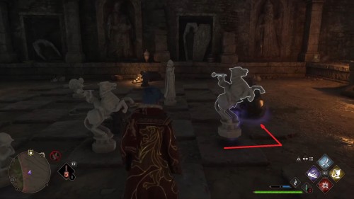 Пробежав по коридору, вы окажетесь в комнате с шахматным полом, по которому расставлены фигуры. Используйте «Ревелио», чтобы обнаружить доступные для взаимодействия предметы, найдите среди них подозрительный и используйте на него чары «Трансформация» – он превратится в шахматную фигуру.