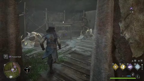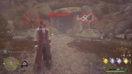 Переходим к следующей головоломке с шахматами в этом регионе. Вход отмечен на карте, а открывается он воздействием «Акцио» на два больших кольца. Правое поддастся сразу, левое нужно зачистить от старых веток с помощью, например, магии «Конфринго».