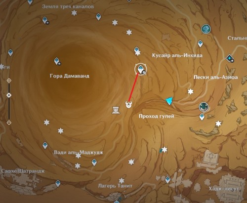 Вероятнее всего, впервые вы увидите комнату с этой головоломкой при выполнении задания мира «Изобилие под песчаными дюнами I» из серии мировых квестов «Панихида Билцис». Чтобы попасть туда, необходимо телепортироваться в место, указанное на изображении ниже, а затем пойти по левому проходу.