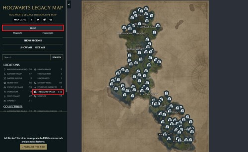 Прежде всего советуем просто отслеживать указанные отметки на своей внутриигровой карте. Также можно найти все хранилища сокровищ на интерактивной карте, выделив в разделе World маркеры Treasure Vault.