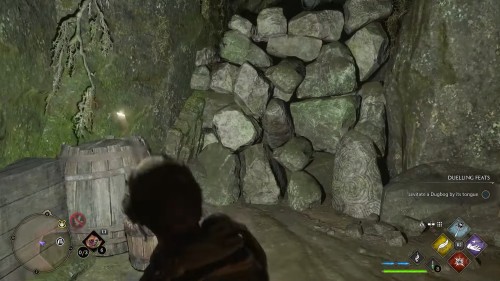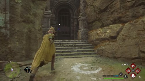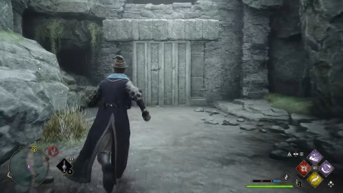 Если ворота перегорожены массивными засовами, найдите рядом два поворотных механизма. Их нужно раскручивать чарами «Депульсо», это будет отодвигать блоки с соответствующей стороны. Просто используйте отталкивающие чары на маховиках, пока это остается возможным.