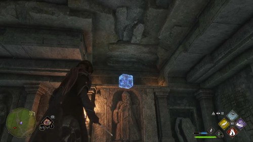 Если в хранилище стоит подобная статуя, попробуйте потушить пламя с помощью чар «Глациус». Монумент повернется, открыв нишу, куда можно встать. Быстрее забирайтесь туда и вскоре окажетесь на противоположной стороне, где и найдете сундук с сокровищами.