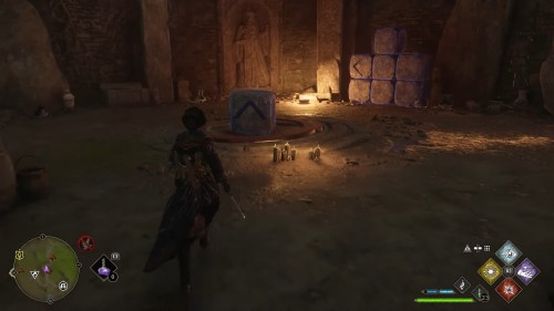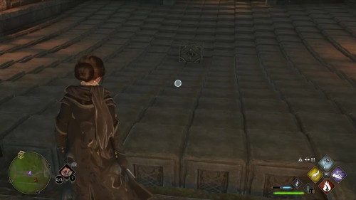 Рядом с подобными колоннами лежит куб с начертанным на нем символом. Требуется положить его на платформу позади столбов с помощью «Левиосо» и воздействовать на куб целевой стихийной магией (это можно сделать как до установки на плиту, так и после).