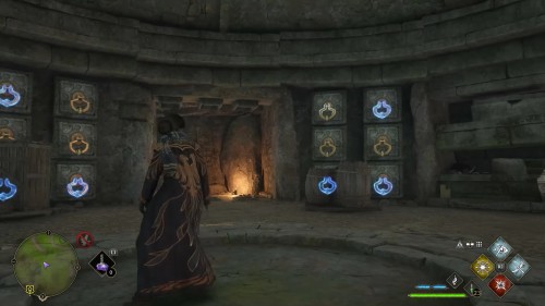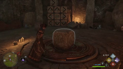 Порой в хранилище может найтись некоторое количество выдвижных блоков с кольцами. Обычно нужно просто подсветить доступные для взаимодействия с помощью «Ревелио», а потом вытянуть активные заклинанием «Акцио».