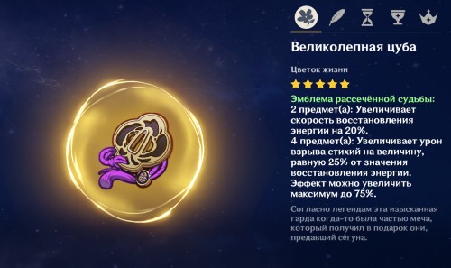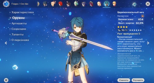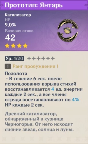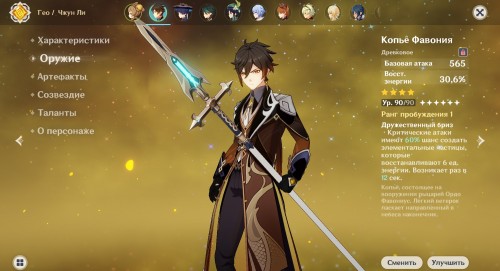 Оружие. Большое количество оружия в качестве дополнительной характеристики имеет восстановление энергии. Отдельно здесь стоит выделить Церемониальную серию и линейку Фавония. Церемониальное оружие позволяет своему носителю повторно использовать элементальный навык при нанесении урона, тем самым генерируя больше частиц. Персонаж с таким оружием станет отличной батарейкой для тиммейта той же стихии, обладающего дорогим ультимейтом. Пассивная способность линейки Фавония при критическом попадании дает возможность носителю создать 3 чистых частицы энергии, тем самым эффективно подкачивая энергию всем членам отряда. Но стоит помнить, что пассивки этих оружий работают, только когда герой находится на поле.