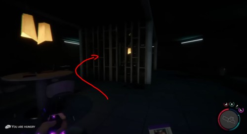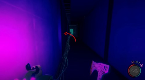 Теперь вернитесь в помещение с бассейном. Слева вы увидите двойные двери и кодовый замок – приложите к ней ранее найденный ключик и пройдите по светлому коридору вперед. Попав в темную область, держитесь левой стороны, а потом сверните в левый проход.