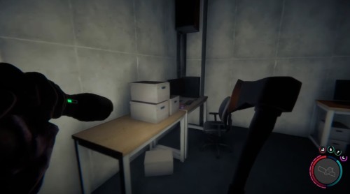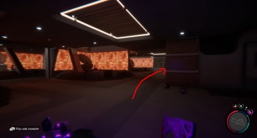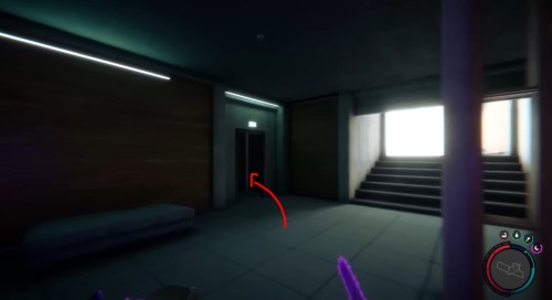 Пройдите немного по пещере и войдите в коридор. Сверните влево и идите к свету. Затем поверните направо и пройдите через двойные двери, воспользовавшись ключом-картой персонала. Вы попадете в просторное помещение. Двигайтесь к фиолетовому экрану впереди и поверните налево.