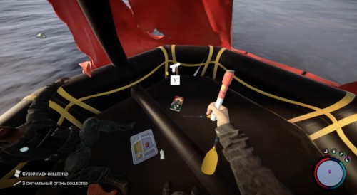 Взобравшись на лодку, вы обнаружите здесь сигнальные огни, сухпайки, GPS радар и пистолет. Можете опробовать свое новое оружие на акуле, плавающей вокруг плота. Если же вам не хочется тратить драгоценные патроны, то используйте против морской хищницы обычный лук.