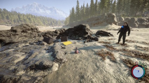 Отыскать первое крепление можно на побережье, куда вы ранее пришли, чтобы найти пистолет. Точное место показано на скриншотах ниже. Двигайтесь к камням на берегу, и вы обнаружите здесь труп, возле которого лежит нужный вам предмет. Вы также найдете несколько патронов к оружию.