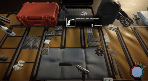 Чтобы установить крепление на пистолет, откройте инвентарь и выберите оба предмета, а затем нажмите на шестеренку. Теперь вы сможете прикреплять к оружию дополнительные модули: фонарик и лазерный прицел.