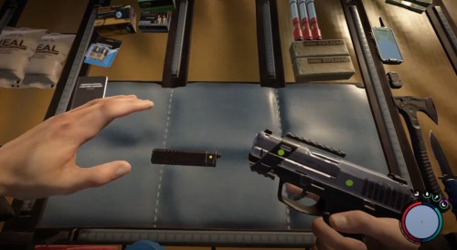 В этом помещении можно найти немало интересных вещей, поэтому хорошенько изучите ее. Например, рядом с телом работника лежит искомое вами оружие, крепление к нему и патроны, а на столе справа можно отыскать аксессуар, позволяющий прикреплять к пушке фонарик.