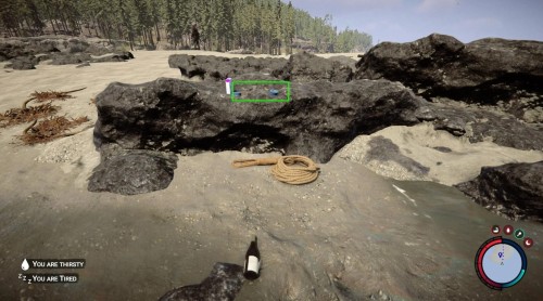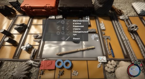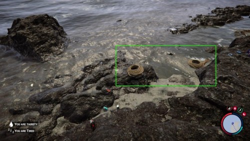 Красным кругом выделена локация, расположенная на побережье рядом с одним из мест вашего спавна. Там вы гарантированно сможете найти две веревки. Добыв все нужные предметы, откройте инвентарь, выберите рецепт самодельного лука и скрафтите его, нажав на шестеренку.