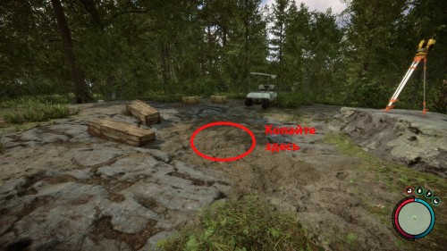 Найти современный лук можно только в одном месте – он спрятан в бункере, расположенном в юго-западной части острова. Вам понадобится лопата, чтобы добраться до него. Итак, отправляйтесь в место, показанное на скриншотах ниже. Нужный вам участок находится в лесной чаще. Его можно увидеть издалека, так как рядом с ним стоит геодезическое оборудование, палаточный лагерь и машина.
