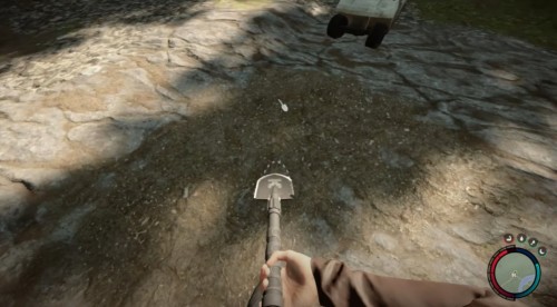Первым делом вам нужно будет добыть лопату, так как вам придется кое-что раскопать. В отдельном руководстве мы в деталях рассказали, как получить этот инструмент. Затем отправляйтесь в место, показанное на скриншотах ниже и расположенное неподалеку от реки. Здесь вы обнаружите своеобразную строительную площадку.