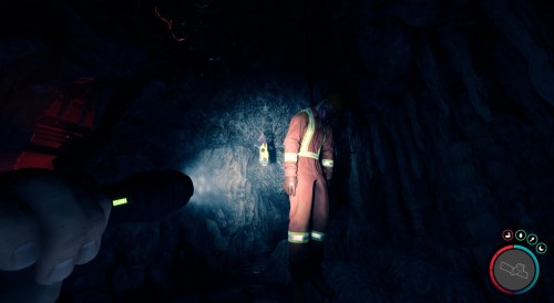 Двигайтесь вперед, никуда не сворачивая. Когда тоннель немного расширится, продолжайте идти прямо. Затем пройдите немного вправо в следующий узкий проход. Вы начнете спускаться, а через 20-30 секунд увидите вдалеке красноватое свечение. Сделайте еще несколько шагов, и вы обнаружите подвешенный к потолку труп – осмотрите его для получения электрошокера. Рядом будет также висеть Тактическая куртка.