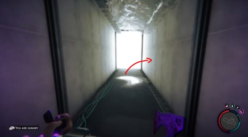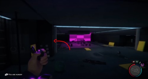 Пройдите немного по пещере и войдите в коридор. Сверните влево и идите к свету. Затем поверните направо и пройдите через двойные двери, воспользовавшись ключом-картой персонала. Вы попадете в просторное помещение. Двигайтесь к фиолетовому экрану впереди и поверните налево.