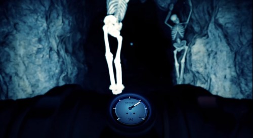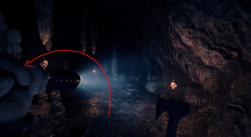 В широкой пещере дойдите до подсвеченного участка, где к потолку прикреплены черепа со свечками и сделайте тут резкий поворот влево на 180 градусов, чтобы начать двигаться по новому пути со сталагмитами. Вы опять окажитесь возле воды, однако тут нужно просто переплыть на другую сторону без использования акваланга.