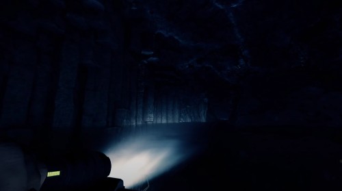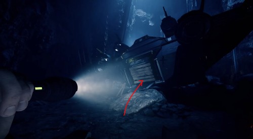 Идите по коридору с элементами инопланетных конструкций и пройдите через узкий проход, к которому ведет дорожка из досок. Оказавшись в новой пещере, идите вперед к доскам, блокирующим путь вперед, и разбейте их. Продолжайте двигаться дальше и спрыгните с высокого уступа вниз.