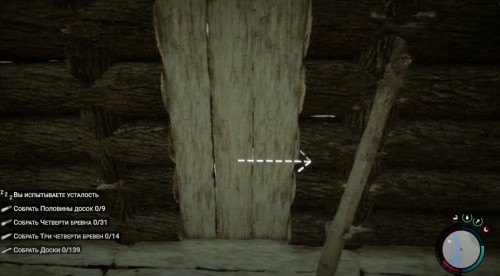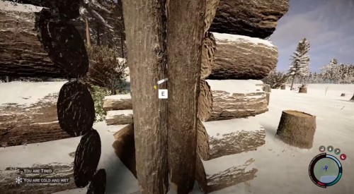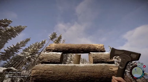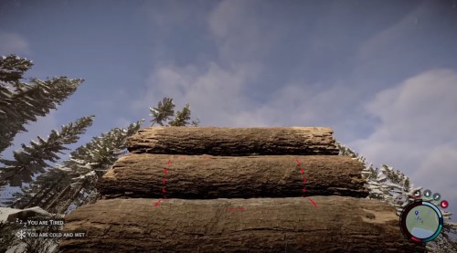 Первым делом срубите несколько деревьев и подготовьте ровно 7 бревен. Затем начните ставить их друг на друга в том месте, где вы хотите создать дверь. У вас должна получиться конструкция, показанная на первом скриншоте ниже. Теперь возьмите в руки любой топор, подойдите к установленным бревнам и поднимите камеру наверх, чтобы появилась красные пунктирные линии.