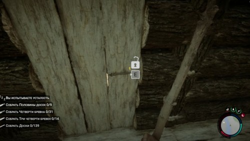 Установив дверь, вы не обезопасите себя от аборигенов, ведь они смогут свободно проходить через нее, как и вы. Чтобы закрыть дверцу, вам необходимо будет установить на нее замок. Для этого возьмите в руки любую палку и подойдите к плоской стороне конструкции – вы должны будете увидеть горизонтальную пунктирную стрелку.