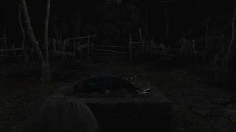 За большими запертыми дверями начинается проход к лесному алтарю, игрушка спрятана за дальней оградой. Придется присмотреться получше, потому что здесь ее действительно тяжело заметить из-за дождя.