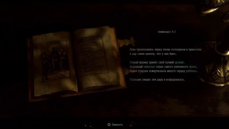 После входа в дом тщательно обыщите все помещения на первом этаже. В дальнем углу вы найдете комод, закрытый на кодовый навесной замок. Шифр к нему скрыт на страницах книги, расположенной на тумбочке в коридоре 2-го этажа. Согласно этим записям, для открытия замка подойдет код из символов: урожай, хряк, ребенок.
