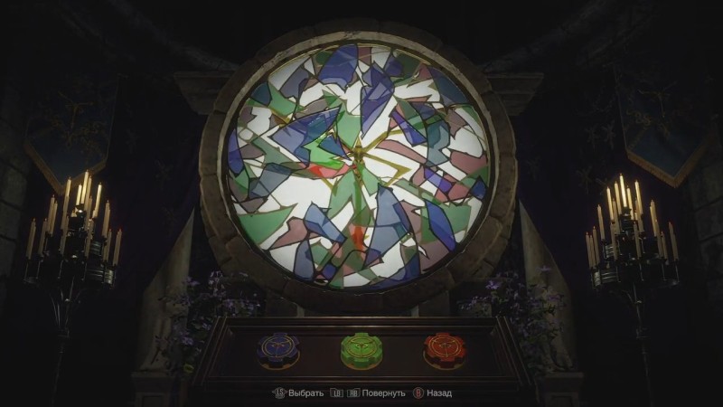 Войдя в церковь, вы сразу же заметите размещенный за алтарем огромный цветной витраж. Используйте рычаг на стене слева от мозаики, и вы увидите панель с элементами управления, на которой не хватает одной из ручек.