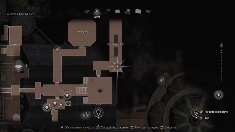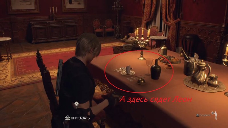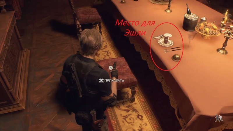 Сперва найдите место королевы для Эшли – за дальним от портретов столом, со стороны изображения короля. Используйте клавишу дополнительного действия, чтобы приказать девушке сесть за стол. Место короля для Леона – ближний стул напротив портрета королевы.