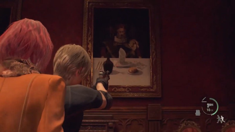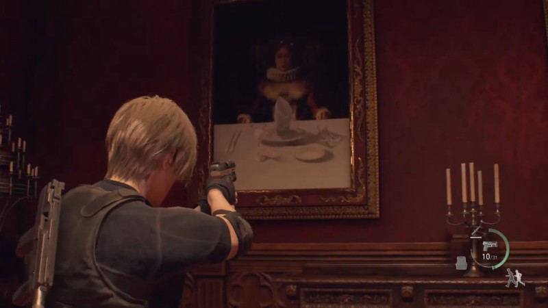 На стене позади столов висят портреты короля и королевы. Для решения головоломки необходимо усадить Леона и Эшли за соответствующие рисункам места в обеденном зале. Обратите внимание на количество приборов и особенности сервировки на картинах: у мужчины по 3 прибора с каждой стороны, бутыль вина и булочка, а у женщины тарелки пусты и всего по два столовых прибора.