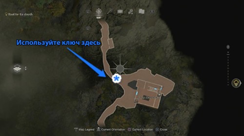 Вернитесь в церковь, откройте решетчатые врата и пройдите через двойные двери. Войдя в здание, подойдите к столику в дальнем правом углу и заберите ключик.