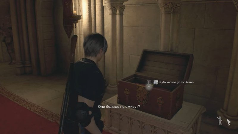 Эшли тоже немного поучаствует в схватке, сбрасывая вазы на головы монстров. Закончив сражение, отправляйтесь в единственный доступный с арены выход и тут же в коридоре прихватите Кубическое устройство, которое понадобится в дальнейшем для открытия подходящих замков.