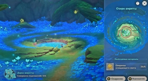 В Genshin Impact Озеро амриты является небольшим волшебным водоемом, расположенным в пустынной области Среди песков (Сумеру). Преподнося ему оперенья очищающего света, вы сможете повышать его уровень, получая разнообразные награды, включая камни истока и мору.