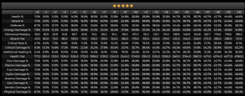 На картинках ниже демонстрируется масштабирование характеристик артефактов (4 и 5 звезды) в зависимости от повышения их уровня.