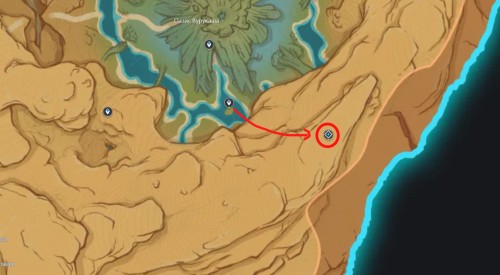 Вход в него находится в юго-восточной части Царства Фарахкерт, неподалеку от Оазиса Вурукаша. В теории попасть в эту область можно уже после прохождения задания Архонтов «Песнь о драконьей свободе» и достижения 40-го ранга приключений, однако мы советуем вам следовать основной истории и начать поиски хотя бы после миссии «Сны, пустота и обман», в ходе которой вы впервые посетите пустынную местность по сюжету. Доберитесь до телепорта, показанного на карте ниже, а затем двигайтесь на юго-восток по дну ущелья.